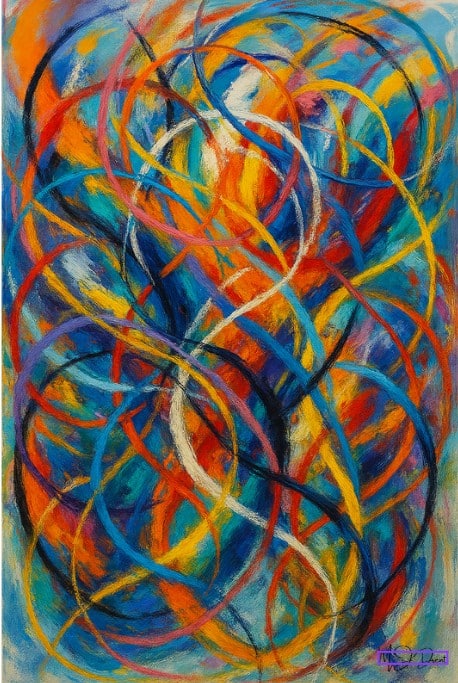 Laat je ogen dwalen over de dynamische vormen en felle tinten die energie en vrijheid uitstralen.